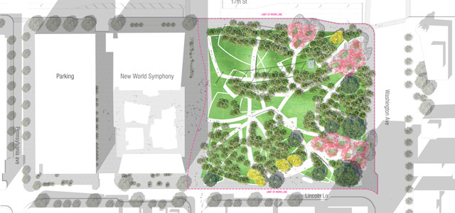 林肯公園位于佛羅里達(dá)州南部華盛頓大道和第十七街,面積略大于1公頃,它致力于建立一個(gè)邁阿密海灘的先例。這樣大小的城市公園往往會(huì)設(shè)計(jì)成硬表面大于軟表面的格局,然而West8在早期就決定了要將其設(shè)計(jì)為可以讓公眾感受綠色并且更像一個(gè)公園的地方,因此林肯公園的位置具體條件、背景和項(xiàng)目引發(fā)了獨(dú)特的反響。