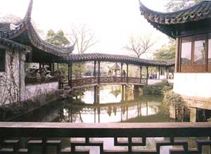 西樓小山叢桂軒為網師園主廳,軒的南、西為兩個小院,幽曲深閉,桂香滿庭。軒北有用黃石疊成的“云崗”。從軒西向北,可至蹈和館和濯纓水閣。水閣懸于池上,倚欄照水,但見波光瀲滟,柳暗花明。中部為主園,有池水一泓,清澈如鏡。環池建廊、軒、亭、榭,夾岸有疊石曲橋,疏密有致,配合得當。池角為園內最小的石拱橋——引靜橋。橋面長僅212厘米,寬29.5厘米。西部為內園,占地一畝,自成庭園。園中有屋宇、亭廊、泉石、花草,體現了蘇州庭園布置的精萃。濯纓水閣和看松讀畫軒隔池相望,是讀書作畫的所在;月到風來亭和射鴨廊遙遙相對,是觀魚和欣賞水中倒影的佳處。殿春簃自成院落,是主人讀書修身之處,環境幽靜,具有典型的明朝風格。網師園的亭臺樓榭無不面水,全園處處有水可倚,布局緊湊,以精巧見長。