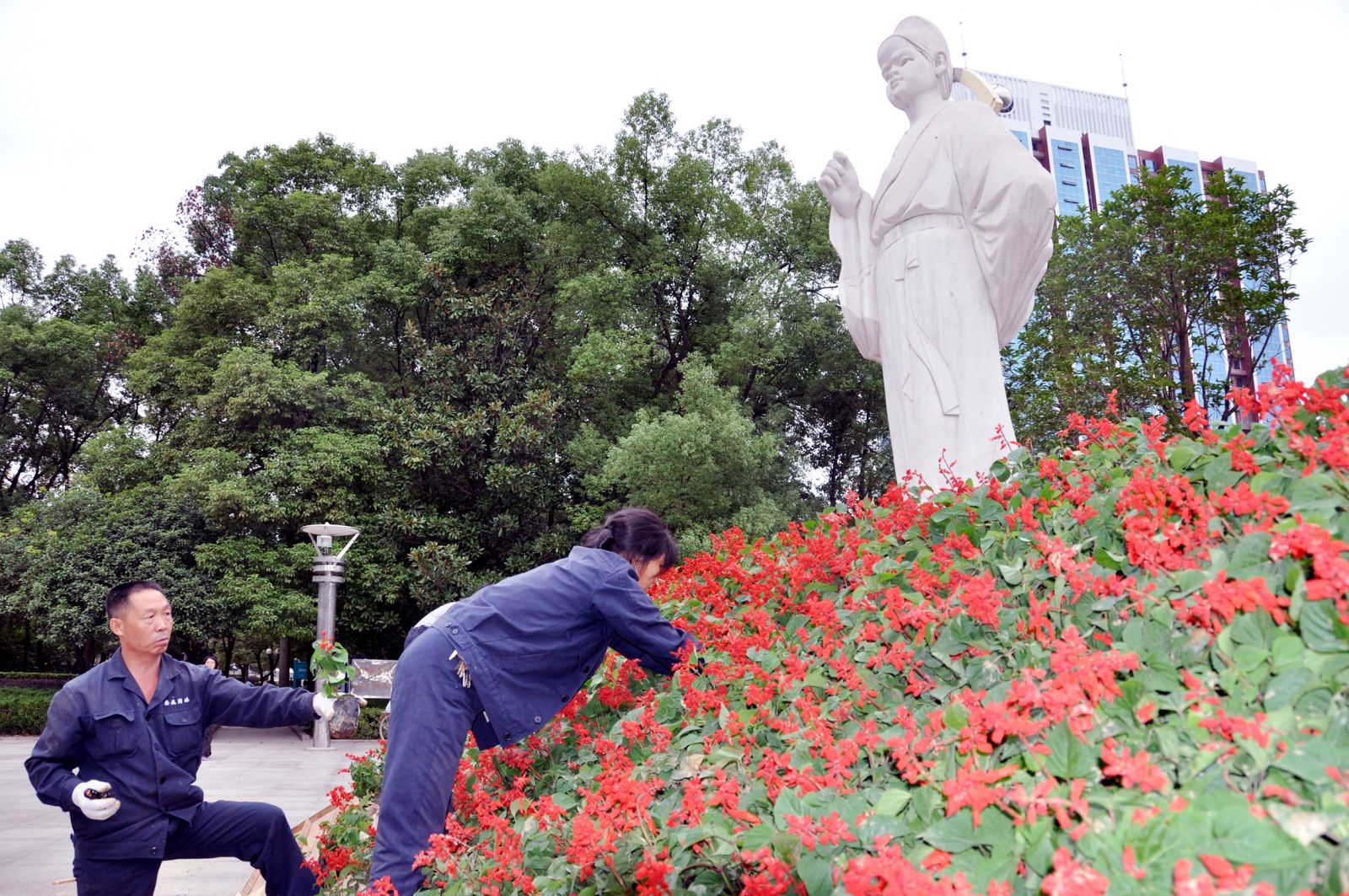 2011年9月18日,工人們正把一盆盆鮮花搬到婁星廣場神童雕塑前的架子上,婁底城區(qū)國慶花卉展覽正式開始布展了。