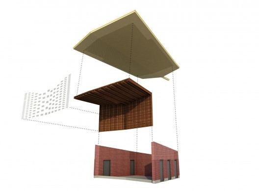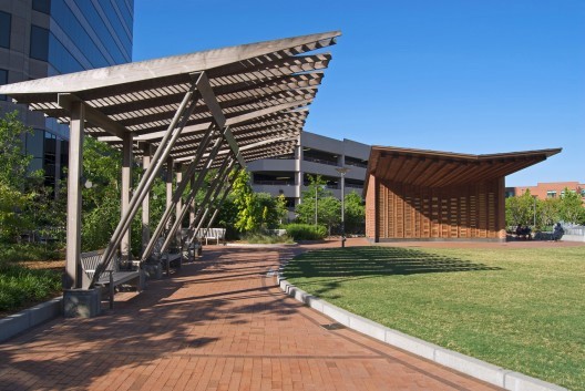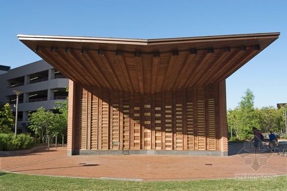中國風景園林網訊  位于美國北卡羅來納州的格林斯博羅市中心公園里有一個為表演和團體聚會設計的陰影漏空式棚架和露天涼亭的結構組合,其形式和結構回應了當地的紡織工業,包括紡織呈現出的樣式和紡織機等元素。紫心木,涂漆鋼鐵,銅制板面,磚塊,花崗巖,堅銅板面等都以標準的細節獨特地組裝起來,形成一個量身定制的樣式和圖案,與場地吻合。