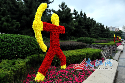 當(dāng)天,記者在南昌八一廣場看到,靠著八一大道一側(cè)的沿邊已經(jīng)擺上花卉,而且在花壇中也擺造出各種運(yùn)動(dòng)造型的“花人”,這些運(yùn)動(dòng)人物栩栩如生,有的在長跑,有的在舉重,有的在射箭……這些造型別致的花卉吸引了市民和游客拍照留念。