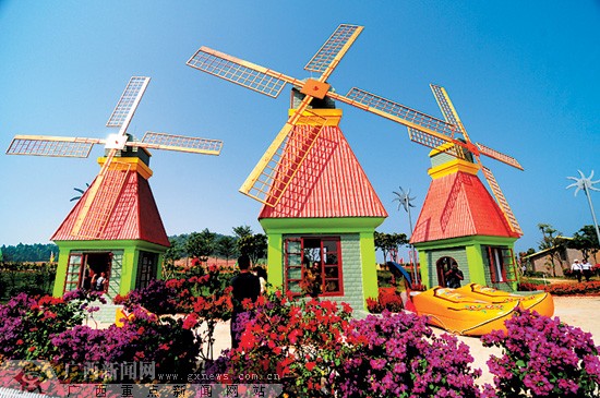 3.荷蘭園:園區中的三組風車建筑,配上繁華錦簇,將荷蘭風情表現得淋漓盡致。木鞋是荷蘭最具代表性的手工藝品,色彩鮮艷的木鞋及高腳凳雕塑小品為園區增添了許多趣味。