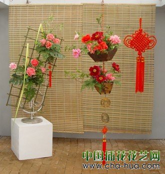 作者梁勤璋,是山東菏澤牡丹專題插花展上的作品。作品以牡丹為主花材,充分展現了牡丹富貴吉祥、繁榮昌盛的寓意,歌頌了中華古國繁榮富強、生機盎然、紅紅火火、感天動地的興旺景象。上下呼應、流光溢彩的斗花與竹框上紅艷艷的牡丹花相互輝映、加上鮮紅的中國結,點明主題,共同譜寫出一曲中華興旺發展的華彩樂章。在葦簾的映襯下,益顯其美侖美奐、光彩奪目!妙用國花牡丹的寓意歌頌華夏的崛起,極易引起人們思想的共鳴,深化和延展了主題和意境,取得理想的藝術效果。