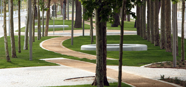 園區中心完全由一些現有和即將移植過來的樹木形成全長為600米的綠地區。這些具有各自獨特外觀特點的大型樹木與巨大的圓形廣場及遍布其中的小路一起主導整個園區的景觀格局。