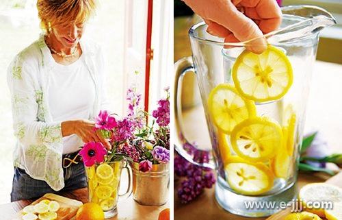 Tips:對比色的運用帶來更賞心悅目的效果,因為檸檬片為明黃色,所以最適合搭配紫色調的花材。