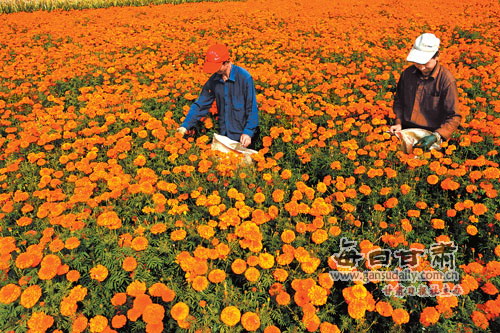 金秋十月,甘州區種植戶在采收金盞菊。甘州區今年花卉新品種種植達百余種,經濟效益明顯。(記者 曹義成)