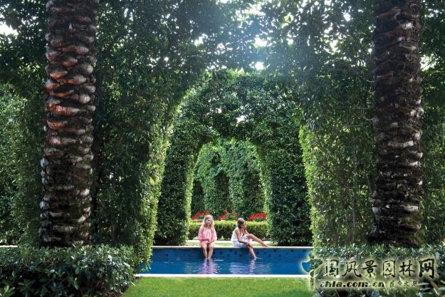 中國風景園林網訊 多個拱形門隔開了大量的古巴桂樹綠籬,彰顯了拱形門的功能性和裝飾作用,成為整個別墅的主脈。