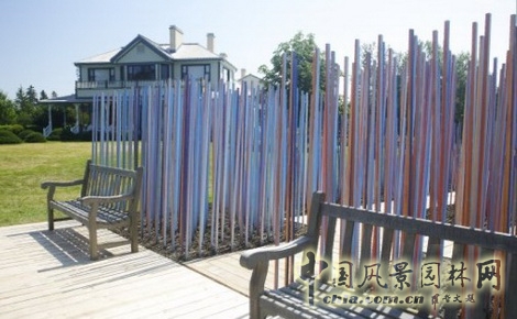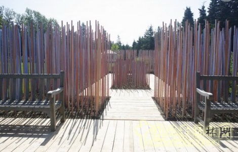 一進入花園,我們所看到的就是傳統的藍色罌粟花,它們像是被掃描了的像素化了的,轉變成為一系列長長的瘦高的柱子。然后,這些柱子被栽種上,形成一個抽象的組合邊界區。三面都畫有藍色,一面畫橘黃色,柱子創造了色彩的效果,簡單卻能給人驚喜:游客徜徉于迷宮般的體驗中,視野中的景色在不斷轉變著。感官接觸體驗重新闡釋了色彩和運動的潮流,融入了當代視覺感染力,這些是從Elsie Reford原始花園中呈現出來的。