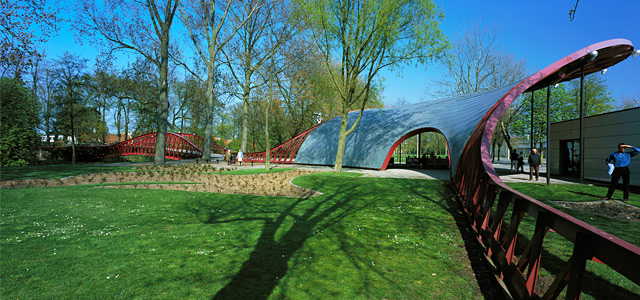 橋梁將處于不同水平線上的Kanaaleiland與城市高地相連,恰好形成了進入Minnewaterpark公園與城市中心的入口。紅色是橋梁鋼架結構的主要色彩,這與周圍綠化植物的顏色形成了強烈的對比,搭配獨特的弧形及星形結構設計與當地水景一起形成了整個城市景觀的一個亮點。
