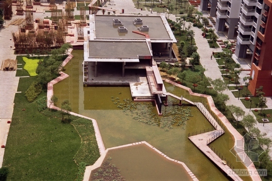 架空步行橋的引入使小區(qū)園林既為屬小區(qū)內(nèi)居民共有的私家園林,同時又可供公眾觀賞,成為城市公園,探討了私家園林和城市公園重疊共生的可能性。收集屋頂雨水,通過水塘逐次跌落過濾,使雨水成為清水。以通常埋于地下的污水處理站、平臺,基礎(chǔ),階梯,坡道,管道,沙坑,土層構(gòu)成穿插跌落的迷宮式景觀。提供可供業(yè)主選擇的養(yǎng)植區(qū)域,促進居民交流。設(shè)置紅色混凝土折板式舞臺,并利用坡地作為看臺,形成居民集會活動場所。