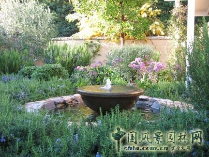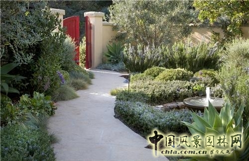 最后的裝飾:庭院植物的顏色和Aldrich選擇的材質搭配出了一種舒適的地中海風格。紅色的對開門,像很熱情主人歡迎來賓步入庭院。然后是石頭小道,引導來賓由入口一直進入到內部。最后,當來賓快進入家門的時候,會聽到從石頭圍成的小噴泉里發出的溫和的水流聲。