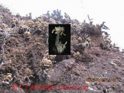 段俊博士在當(dāng)?shù)厮庌r(nóng)的帶領(lǐng)下,發(fā)現(xiàn)其中某山頭的野生鐵皮石斛生長于朝西的石壁上,環(huán)境非常干燥。此石壁上只生長一些蕨類植物和景天科植物等草本植物,并且除一些景天科植物之外,其它植物因干旱已經(jīng)枯死。此處的鐵皮石斛長得非常矮小,它不是附生在石壁上,而是附生于石壁的蕨類植物上,并且直接暴露于陽光之下,被附生的蕨類植物也因干旱而枯萎,如此生長環(huán)境確實(shí)比較特殊。