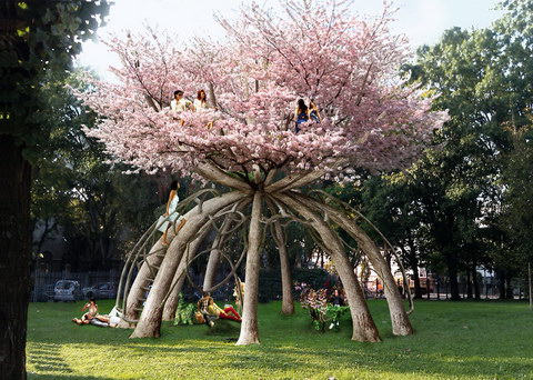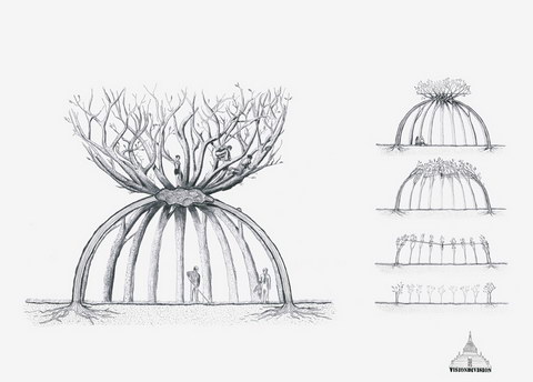 10棵日本的櫻花樹提供了建筑的主要結構,櫻花樹栽種在一個直徑8米的圓中。六米高的臨時木結構建在中心,將作為引導塔架,作為不斷生長的櫻花樹的結構。四課樹將作為兩組樓梯,通向未來的上層(樹上的小樹枝被電線捆綁引導著,互相向樓梯處生長,希望接下來會有所用。樓梯的其余部分可以以后在樓梯樹上嫁接),然后周圍的植物捆綁繩索,略彎向臨時塔架。在這個結構中,有裝飾花紋的木頭將被嫁接上,留出樹之間的兩塊空間作為進出口,其余的通過小樹枝靠近裝飾花紋。時間是這個項目的重要組成部分,因為當樹木開始生長,其小樹枝將形成一個圓頂,當他們到達塔架頂端,然后轉變方向時,一個最終的沙漏形狀就形成了。