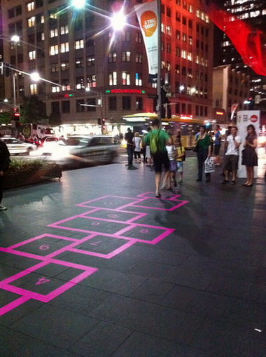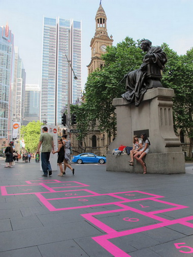 HASSELL通過Walk the Line這項作品,使城市空間重新煥發生機,簡單地在畫畫線,就可以將選定的區域轉變成為游戲空間。街角變成跳房子區、網球場、彈球場;樓梯變成瀑布,十字路口成了大型電玩場地。