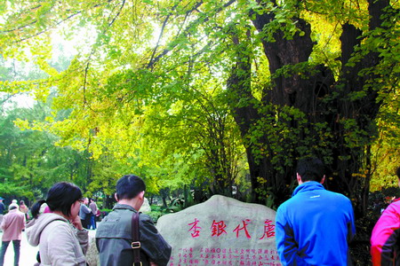 相傳這株銀杏明末遭火焚,清朝被雷擊,僅留木樹樁。“現在這株銀杏生長良好。”公園方負責人告訴記者,經本園職工精心栽培,細心養護,現在枝嫩葉茂,煥發青春。“我們春季對這株唐代銀杏施肥,夏季注意水分的管理以及病蟲害的防治,主要針對白蟻的防治,冬季掉葉后枝條修剪。現在整個銀杏的葉態葉貌都非常優美,雄偉壯麗。”