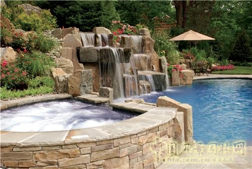 這個創新性的改革是由景觀建筑公司Cipriano完成的,他們用柱狀的石頭層創建了兩個7階式瀑布的水體景觀,一個流入到游泳池中,另一個流入到房子平臺邊上的水池里。這個設計不只是臺階的改革,而且也是使硬景非常自然地融入到自然景觀中。而且,項目設計師BillMoore設計讓戶主可以享受瀑布的美景和不同高度的自然水池。