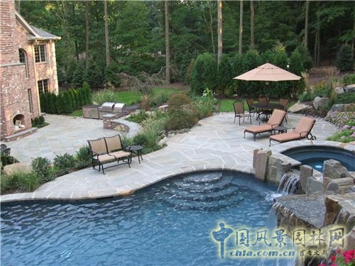 戶主也想要一塊足夠大的場地可以容納多種娛樂愛好的人。所以除了階梯瀑布外,這個景觀設計還包括一個溫泉浴場、一個戶外火爐、一個全設備廚房和酒吧臺、一個觀賞草魚的池塘和一個和一個大餐桌。在家人消遣娛樂或宴請朋友時,這個寬敞的餐飲和廚房很精簡地彌補了這塊自然區。