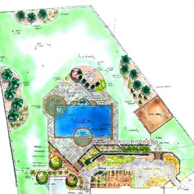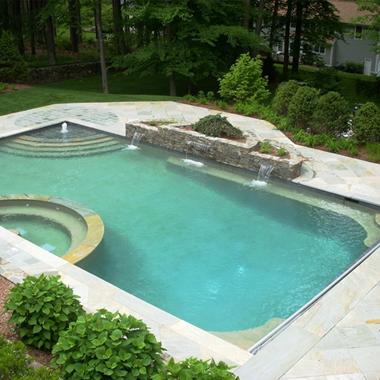 庭院里的大水池是為一個有2個孩子的家庭設計,是按家長要求,為孩子在陽光下安全玩耍而精心設計的休閑環境。在水池里,為家長專門設計的是直徑為14英尺的溫泉浴池,而且它可以在不使用時,通過一個自動的安全蓋關閉上。為孩子們專門設計的是水池邊上的太陽形狀的小噴泉和水池邊上,通過石頭種植臺流出的三個層次的瀑布,水池里的邊緣還設置有長條坐凳。