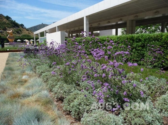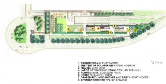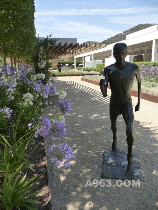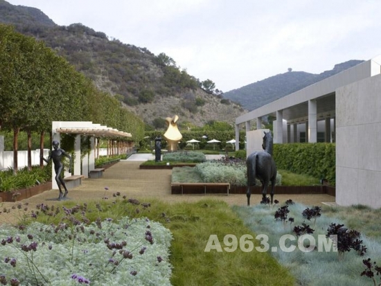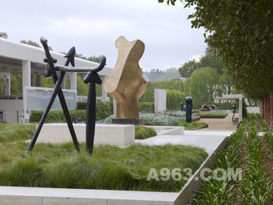 OLIN和Richard Meier合作設計這個項目,從全局考慮,為蓋蒂第一屆當代雕塑輯的28座雕塑設計了與之相協調的建筑與景觀。景觀與雕塑相兼容,讓每一件雕塑的獨特性展現。藝術品與觀眾也是互動的。有的放置在安靜的區域,臨近作為或者水景,有些則放置在可以俯瞰洛杉磯風景的地方。最后博物館收藏了其中的8件,他們仍然在博物館內的花園中。
