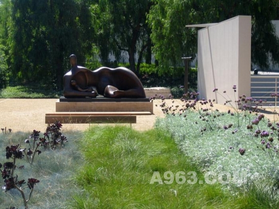 ▲白墻前面Peter Shelton的 ‘Bronzenightshirt’ 和 Henry Moore的 ‘Draped Reclining Mother and Baby’。圖片前端的植物一年四季都是茂綠的,設計主要考慮其形式和機理。