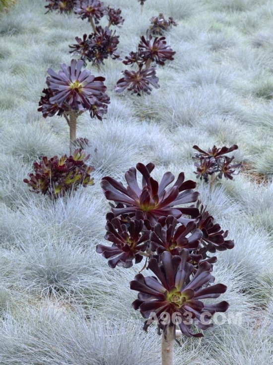 ▲藍色高羊茅的“Glacua”品種和紫色景滅科蓮花掌屬蓮花掌的“Zwartkop”品種混種細節,他們的葉片形狀,顏色,機理產生了對比。