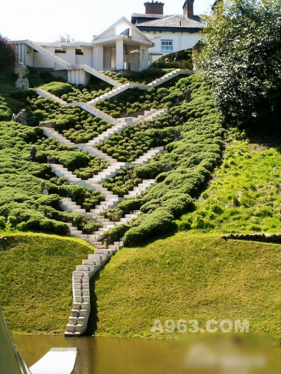 蘇格蘭西南部,有一個(gè)花園叫做“Garden of Cosmic Speculation”,里面的景觀設(shè)計(jì)全部按照各種數(shù)學(xué)與科學(xué)圖形進(jìn)行設(shè)計(jì)規(guī)劃,如分形,螺旋,黑洞……花園內(nèi)植物不是很茂密,甚至有些空曠之感,但根據(jù)數(shù)學(xué)公式,曲線等制作出的地形地貌成為花園最奇特的地方。其中后花園的大臺(tái)階最具戲劇性,也最吸引人。
