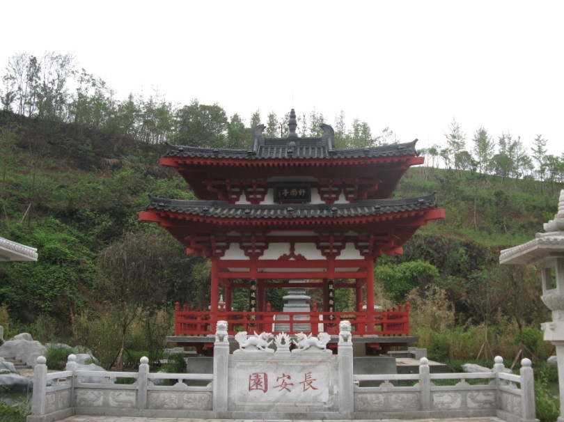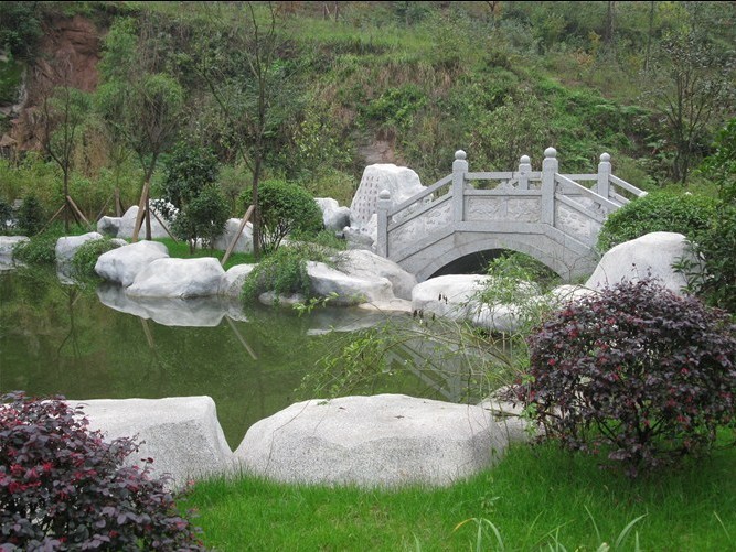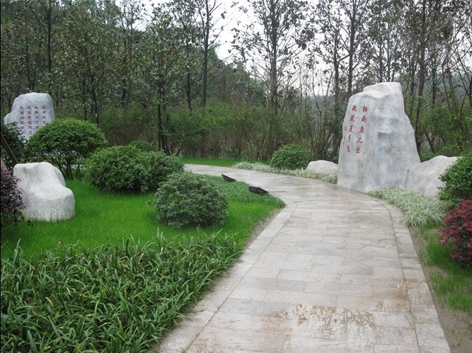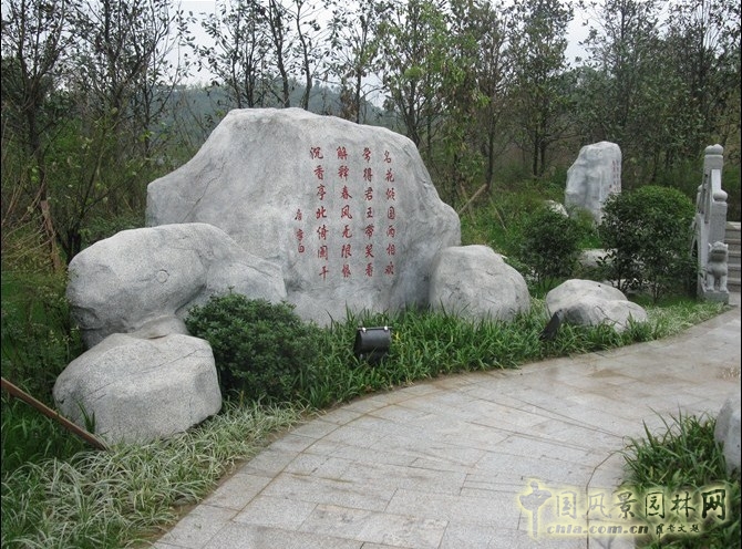 3、長安園入口處于中軸線上,并設(shè)置親水平臺,中心設(shè)置圓形地景。石質(zhì)欄桿護(hù)岸,桿柱之間有銘壁,鐫刻"長安園"。自然式園路把各景點串接起來,臨水架橋,遇坡修臺,見石繞行,達(dá)到自然流暢。在園路兩側(cè)布置景石、石刻,高低錯落,疏密有致,自然成趣。