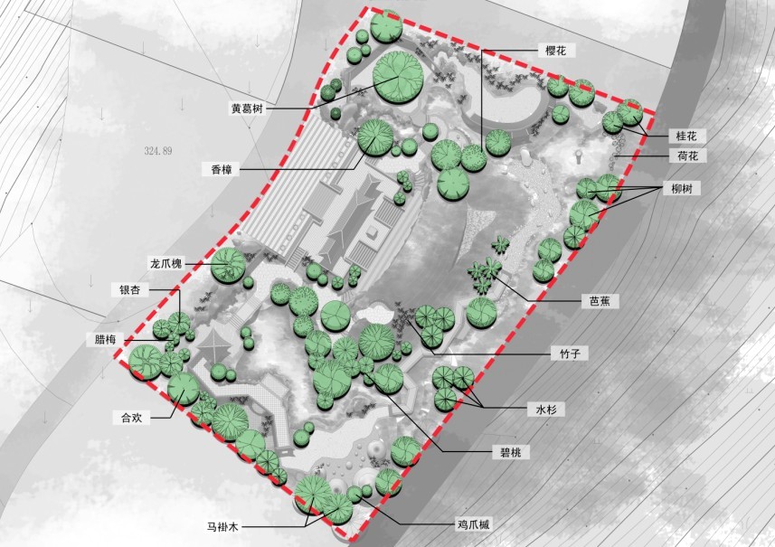 園林的核心為"山""水",而遂寧的發(fā)展也圍繞在山水之間:山--遂寧的標(biāo)志船山,水--養(yǎng)育斗城的涪江。以一山一江為設(shè)計線索和空間構(gòu)架,將核心景觀依水環(huán)山的布置,形成景觀的序列,構(gòu)架空間雛形。