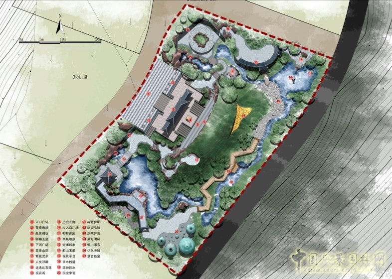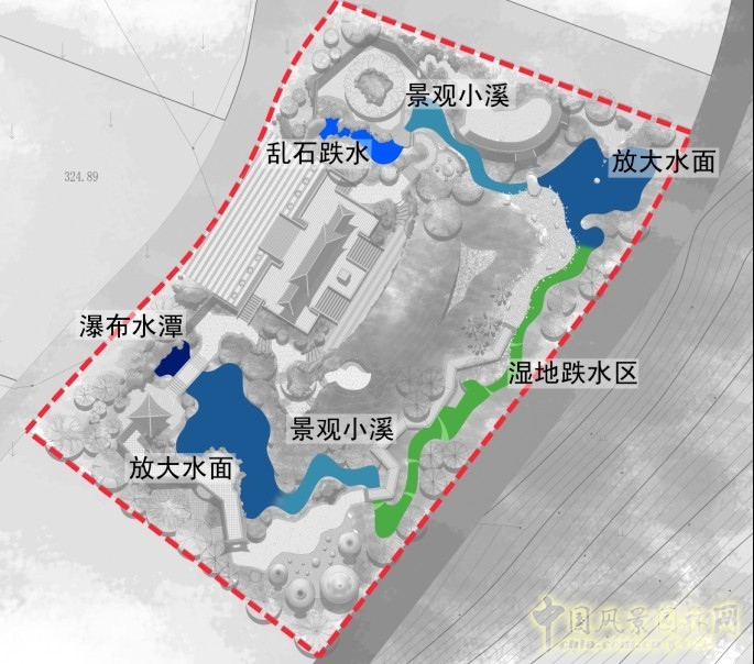 而本次的空間組織打破了常規(guī)做法,首先利用一占一環(huán),兩大空間手法,控制住整個場地結(jié)構(gòu),并結(jié)合設(shè)計中豎向高差,有機的布置出開閉不同的景觀空間,高低錯落,或環(huán)或敞,達到園林設(shè)計中"一步一景,步移景異"的景觀效果。
