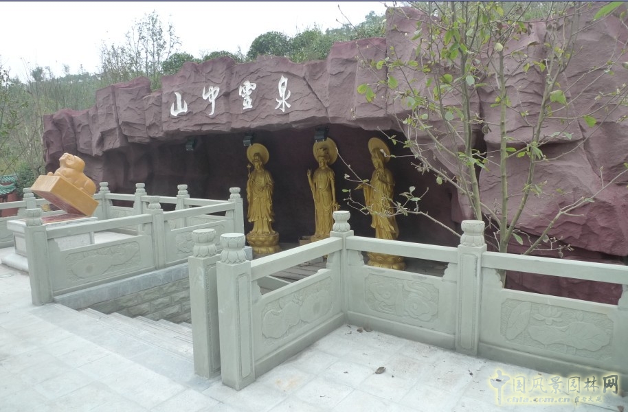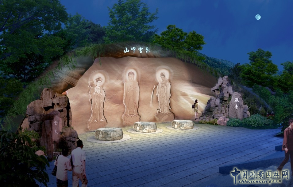 觀音靈泉:在堆砌的船山之中設(shè)置山洞與廣德大殿直接聯(lián)系,將靈泉寺內(nèi)三口水位高低不同的泉井布置其中并與每口井后設(shè)置觀音浮雕像,突出靈泉觀音文化。