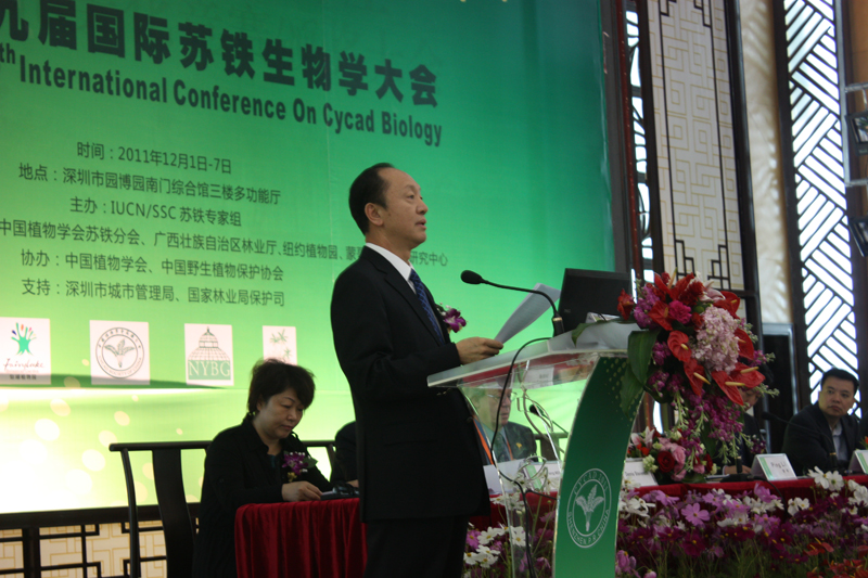 2011年12月2日,由世界自然保護(hù)聯(lián)盟物種保育委員會蘇鐵專家組(IUCN/SSC CYCAD SPECIALIST GROUP)主辦,中國植物學(xué)會蘇鐵分會、廣西林業(yè)廳和上海仙湖植物園聯(lián)合承辦的第九屆國際蘇鐵生物學(xué)大會,在深圳市園林花卉博覽園綜合館3樓多功能會議廳開幕。開幕式由上海仙湖植物園朱偉華主任主持,國家林業(yè)局野生動植物保護(hù)和自然保護(hù)區(qū)管理司張希武司長、深圳市政府李平秘書長、國際自然保護(hù)聯(lián)盟蘇鐵專業(yè)委員會主席約翰?唐納德博士、蘇鐵學(xué)委會主席丹尼斯?斯蒂文森博士出席開幕式并分別致辭。