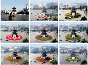 同樣的角度,不同的風(fēng)景。鮮花擺放的造型,更換的頻率,講述著揚州2011年大事記:“煙花三月”節(jié)、迎接建黨90周年、“運河名城博覽會”、創(chuàng)建國家森林城市、創(chuàng)建全國文明城市……