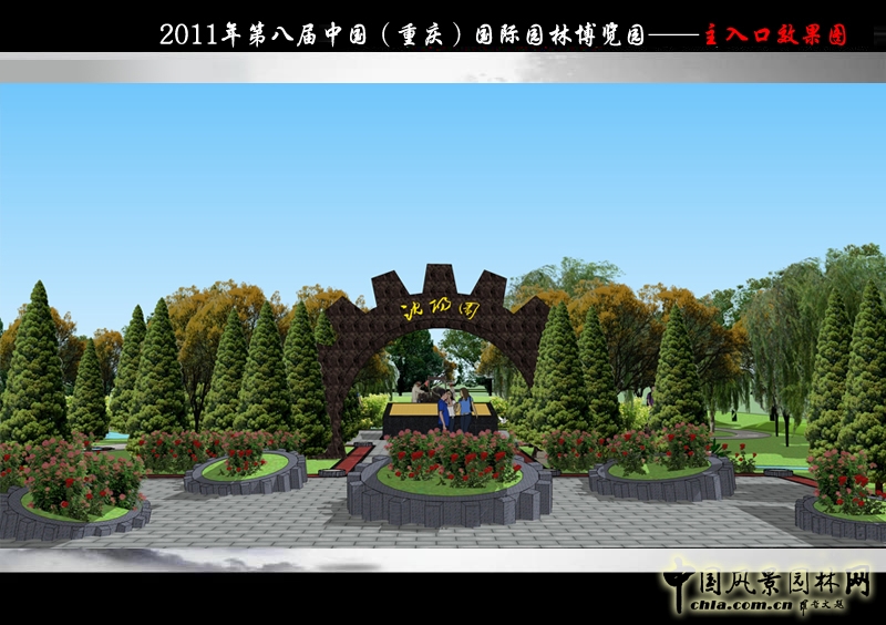 1、中心廣場:置于園區(qū)南側(cè),與展園主入口融于一體。由特色花壇、浮雕齒輪拱門、盛京賦、親水平臺組成。