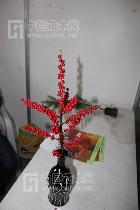北美冬青的果實不單可以當盆栽欣賞,在展位上,筆者還看到一個美麗的花瓶里面插著幾株北美冬青的果實,擺放在那里,展位上的工作人員介紹到,此果實也能象插花一樣放在花瓶里面擺放著欣賞,用點水養著,能保持4-5個月,而且果子的顏色都會保持著這么鮮艷。