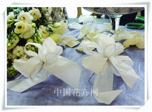 準(zhǔn)備配飾:白色金邊絲帶,打成多個(gè)蝴蝶結(jié)花飾。