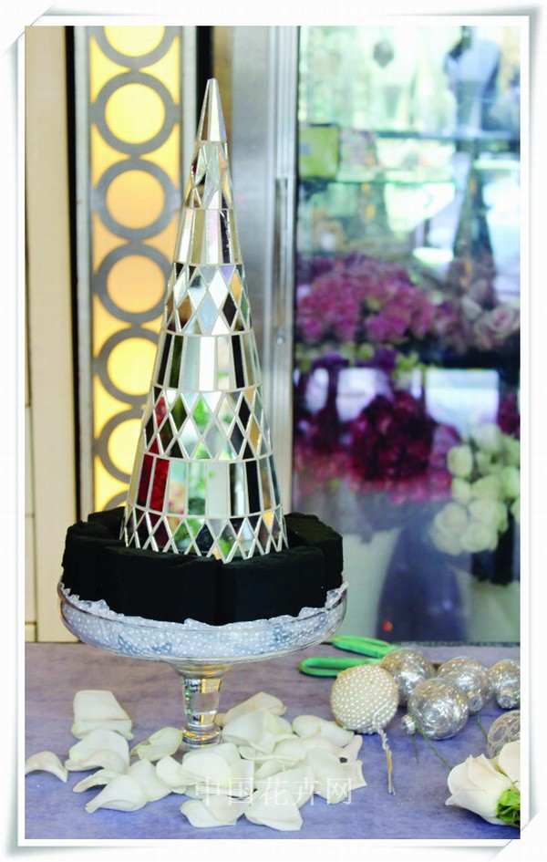 第一步:將鏡面圣誕柱擺在圓盤花泥正中,并放穩(wěn)。