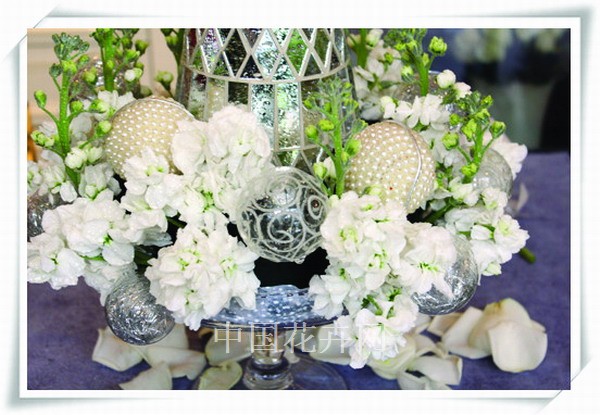 第二步:以白色銅絲固定圣誕花球,并分散插入花泥。