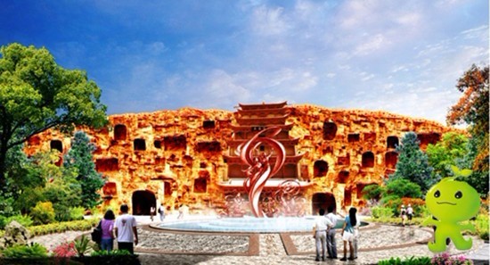 仿制莫高窟的質感,假山成為雕塑"大夢敦煌"的舞臺背景。效果圖