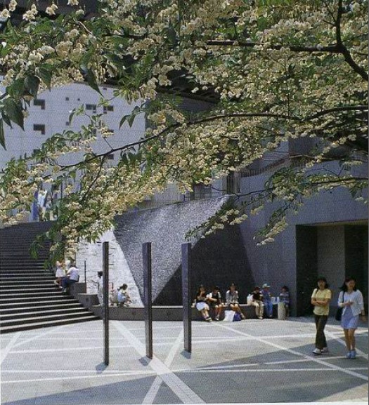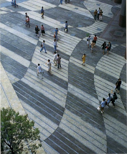廣場的地面建成平緩的波浪圖案,在臺階側面營造了階梯瀑布,并鋪設了作為約會空間使用的地面,其上立有黑色石板。地面布局隨著與建筑物距離的縮短,被階段性的細分為更為人性化的格局。