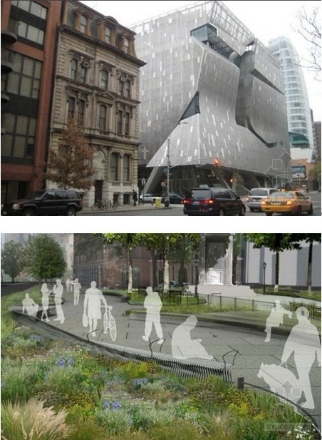 紐約城剛剛公布了東村中心區的一項綠色規劃,該規劃將給這里的行人提供更安全的環境。這項設計要求去掉這條街道上的兩大部分—位于拉法葉和第四大道之間的亞斯特坊廣場的一部分和位于第五大街和亞斯特坊之間的Bowery區的一部分,這兩部分都因行人難以躲避車輛而出名。Bowery區將變成8000平方英尺的“鄉村廣場”,這里有隆起的種植地、樹木和一系列座椅。該方案還提議鋪設一條蜿蜒的紅色地帶,旨在喚起人們對曾經位于曼哈頓這個區域的古老的美國本土道路的懷念。這些城市規劃設計是一種很好的方式,確保步行經過這里的人們有時間停下來,欣賞這些令人驚嘆的歷史建筑和新建筑,如庫伯聯合學院建筑,不再是像以前那樣忙著躲避快速行駛的出租車了。