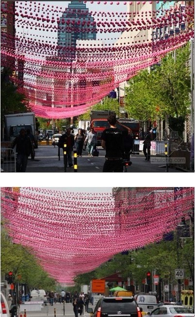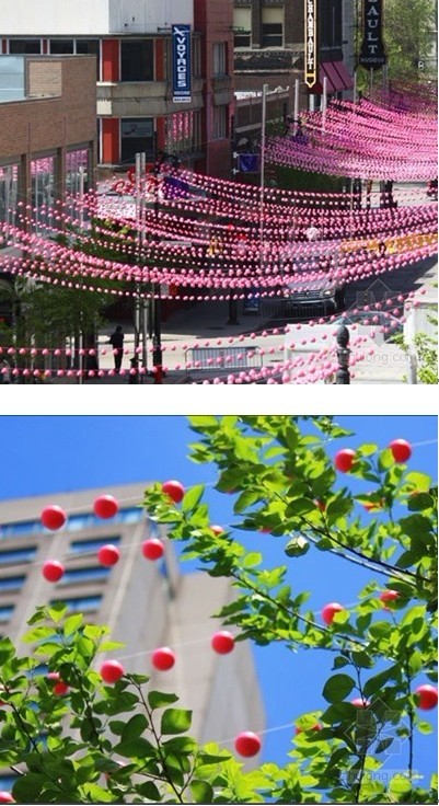 步行街要怎么設(shè)計(jì)才會有趣,加拿大魁北克為了步行街氣氛的營造,特地用了170000個(gè)粉紅塑料球來打扮。營造視覺盛宴。