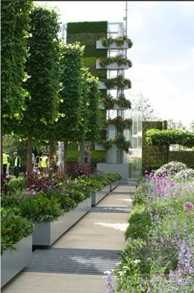 這個花園是切爾西花展至今為止最高的花園,它的設計是為了鼓勵個人和社區發展可持續的食物種植空間,提升城市綠色面積。B&Q采用的方法之一是垂直的種植盒子,所有種植在這個園中的東西都是可以食用的。一個棚子里包括堆制肥料,雨水收集,熱能煙囪,太陽能板和渦輪機等。種植策略既包括裝飾性的,也有自然品種,設計展示出我們可食用植物的多樣化品種,其中有種子,花朵,還有果實,根莖等等。
