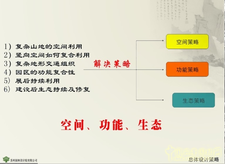 蘇州園的總體造園宗旨是要打造富有傳統(tǒng)風(fēng),古典風(fēng)的典型蘇州園林。總體設(shè)計(jì)考慮空間策略、功能策略、生態(tài)策略三個(gè)方面,具體實(shí)施為復(fù)雜山地的空間利用、豎向空間復(fù)合利用、復(fù)雜地形交通組織、園區(qū)的功能復(fù)合性、展后持續(xù)利用、建設(shè)后生態(tài)持續(xù)及修復(fù),體現(xiàn)出因地制宜、因勢(shì)成景的設(shè)計(jì)思想。