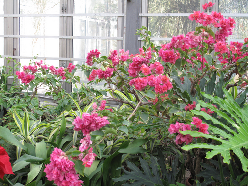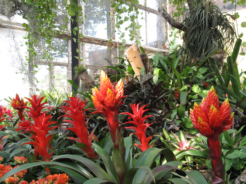 2012年的迎新花展主要在展覽溫室內舉辦,一派紅火景象,烘托出喜慶的節日氛圍。大紅色的一品紅、紅掌、天竺葵、扶桑;紫紅色的紅花羊蹄甲、三角梅、蟹爪蘭;還有熱帶蘭花、鳳梨、麗格海棠、兔子花、何氏鳳仙等也在競爭紅色系花的主角,從桃紅色、粉紅色、橙紅色等囊括了各類紅色;辣椒“蘇格蘭童帽”的枝頭掛滿了大紅色、造型奇特的果實,也加入了這場角逐。各類紅色花果擺開了陣勢,讓溫室內紅紅火火,看點多多,不乏新意。