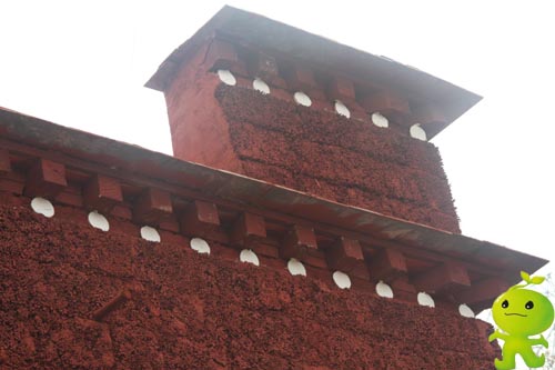 邊瑪草又名怪柳枝,是一種生長于高寒地區深山中的灌叢,這種灌叢質地堅硬且枝條長少有分叉,不易彎曲,不易腐爛,去掉葉子和皮后,再染紅就成了藏式建筑上半部外墻的裝飾材料,是寺廟、宮殿或達賴家眷公館建筑頂部的一種特有裝飾材料,人們習慣將用邊瑪草裝飾過的墻面叫邊瑪墻。