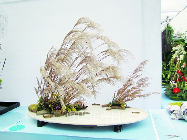 此作品是用蘆葦、龜紋石等材料制作的盆景式插花《秋江垂釣圖》。