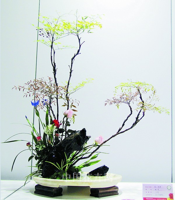 此作品為第四屆中國月季花展暨2010世界月季聯(lián)合會區(qū)域性大會上,王小軍用南天竹、月季、鳶尾等花材以及觀賞石制作的盆景式插花《春江美景》,該作品在本次花展中獲得銀獎。