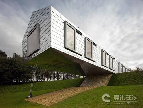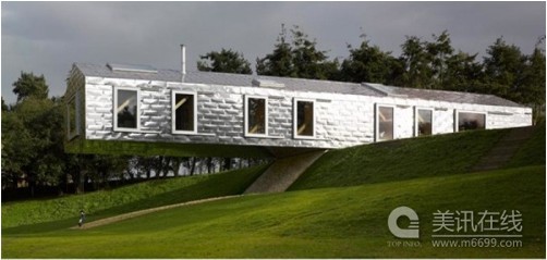 建筑的總長度為30米,其中的15米坐落在綠色山坡上“保持著平衡”,似乎是為秋千提供一個固定,從而坐在上面可以體驗飛行的感覺。更何況這個時候在頭上就只有天空,還有映照在“鏡”面外墻上自己的活動。