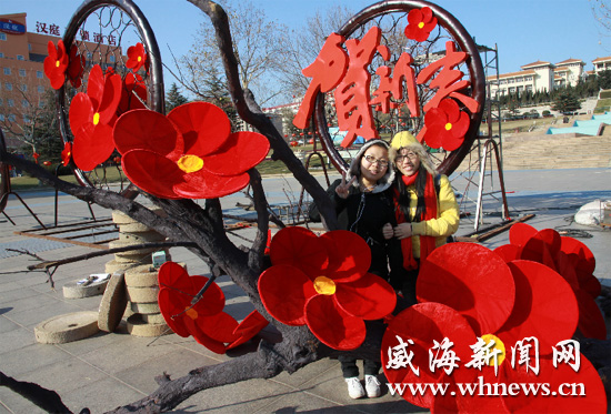 威海城市園林景觀“紅梅迎春”亮相人民廣場