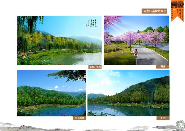 在景觀結構上結合現狀"山擁水環"的景觀氣勢,規劃營造"一軸多帶"景觀結構,山擁為眾星拱月之勢,水環為平湖映翠之景,一軸為啟承轉合之序,多帶為層疊輾轉之韻。在景點分布上結合園博園群山環繞之形,營造園博園十大景點,分別為臥龍石刻、廊橋飛瀑、雙亭瀑布、瞑閣暮鐘、重云繞塔、沐風幽廊、梅苑山莊、龍景書院、青山茅廬、千里云頂。